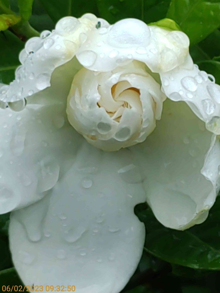 純白のクチナシのお花が、雨に打たれ、その雫で一層優美に見えました。