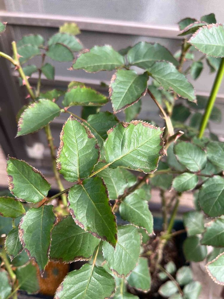 ロサオリエンティス トリニティです。花後、急に葉の縁が枯れて来ました😭何の症状でしょうか?何か病気でしょうか?