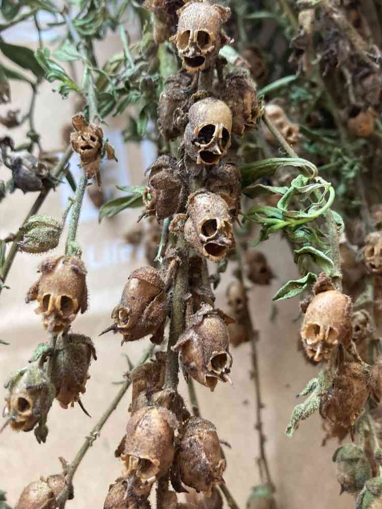 骸骨💀の目とか口から黒い小さなタネが出てきます。面白いですよね。お花は金魚みたいなのに。なんで笑