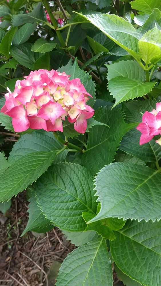 青い葉葉に映える赤い紫陽花🎵鮮やかです😄