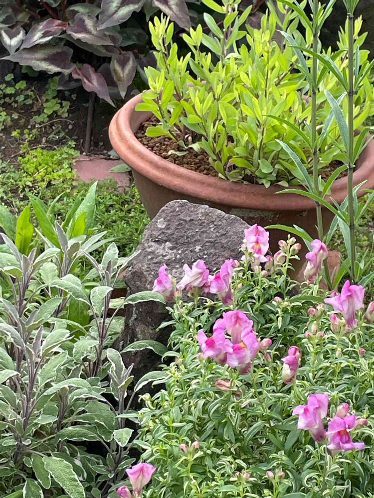 左はトリカラーセージ、右は斑入りの金魚草、奥にある鉢はガイラルディアグレープセンセーション🍇