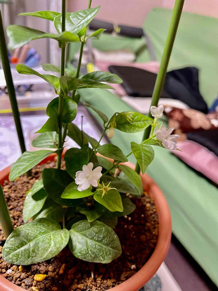 一重咲きのほうのジャスミン、って普通咲きのジャスミン、花が咲きました。ホント良い匂い❤️🥰毎日咲いては散っていく感じなのですね!蕾が開くぐらいが1番良い匂い❣️