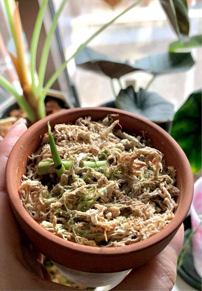 茎伏せ中のマドカズラさん、親株は綺麗なハーフムーンなのですが、生えてきた芽は緑一色っぽい?残念😅