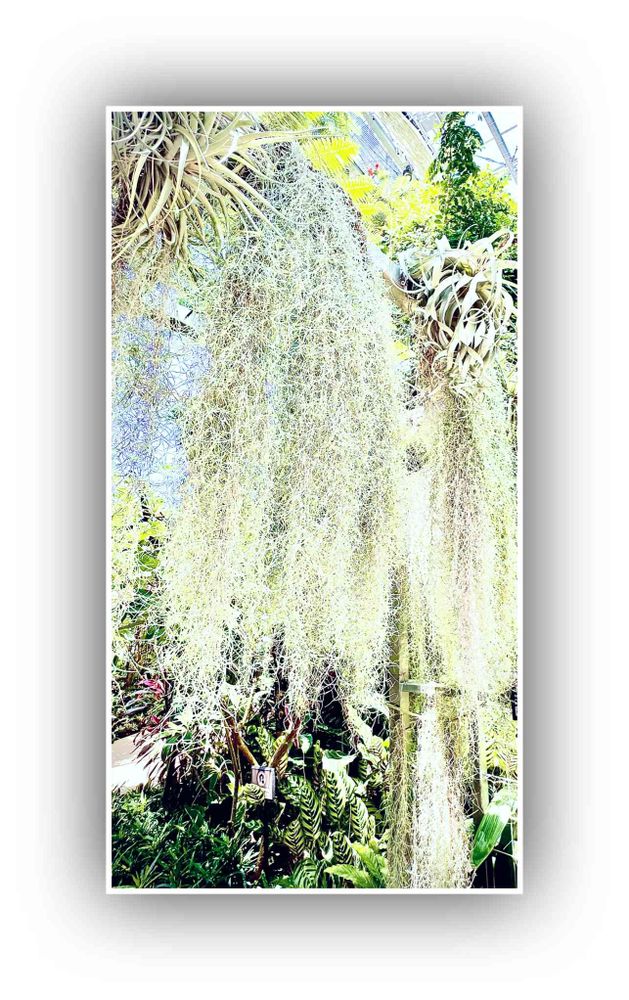📝この写真画像は、宮崎市青島に在る「宮交ボタニックガーデン青島」の施設:大温室ハウスの中で、のれんのように垂れ下がっている「チランジア ウスネオイデス」の様子を撮ってみたものデス🐶