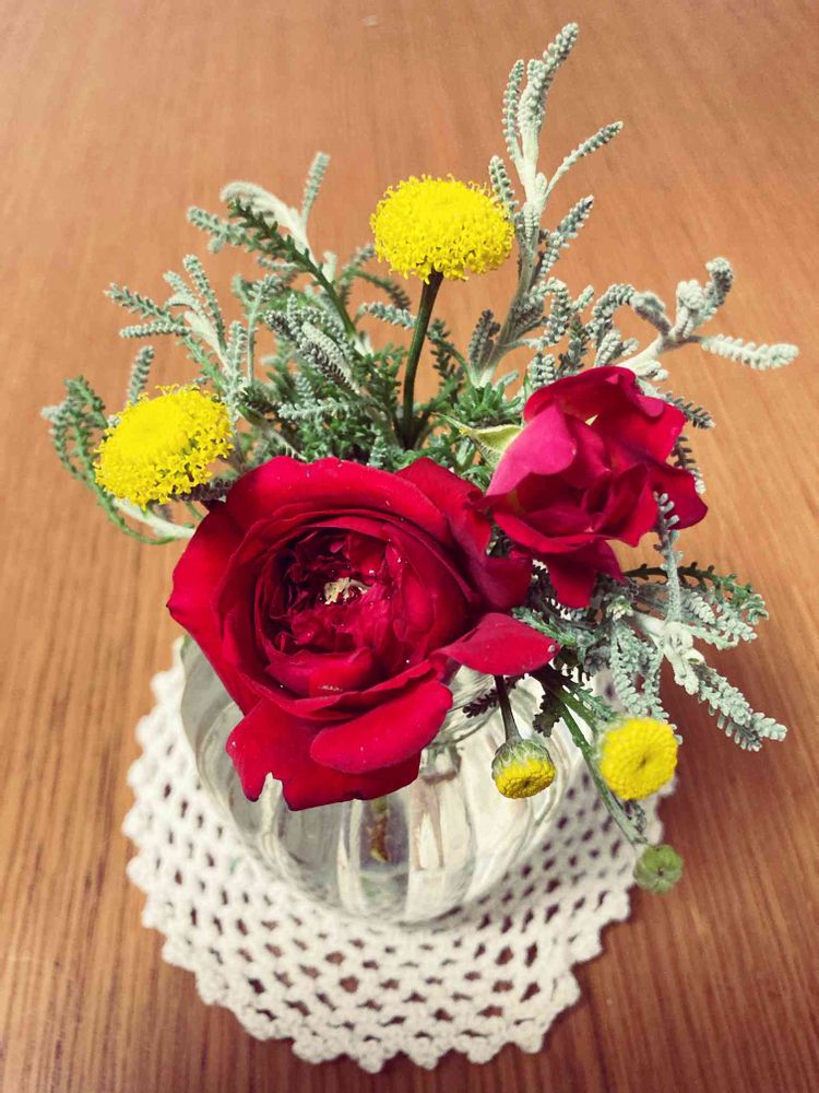 薔薇フロレンティーナは、まだ挿木して今年2年目なので、10個咲きましたが、早めにカットしています。右側の小さいのは、レッドドリフト。黄色のお花は、2年目のサントリナ。