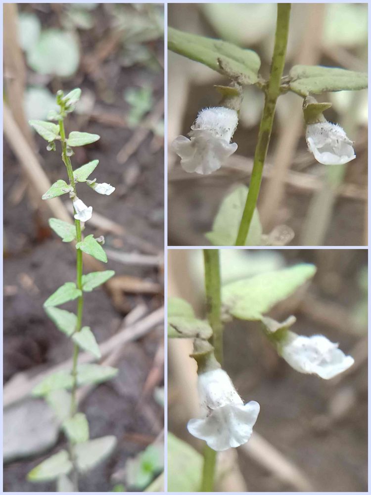 花は上部の葉腋に1個ずつつけ、花冠は長さ約7mm、白色でやや淡紅紫色をおび、基部はわずかに曲がる。下唇には紫色の斑点があります。