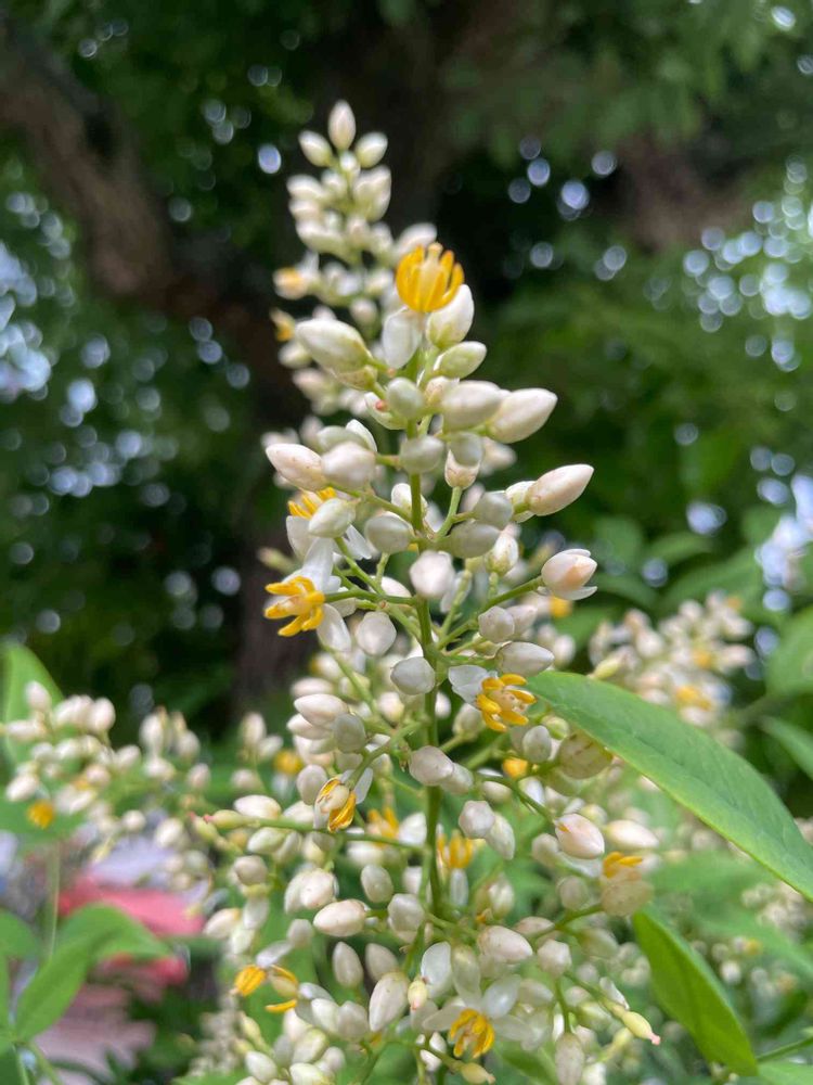 南天の白い花が沢山咲いていますね🌿🤍✨🤍🌿 💛黄色のガク?もかわいい💕(๑˃̵ᴗ˂̵)