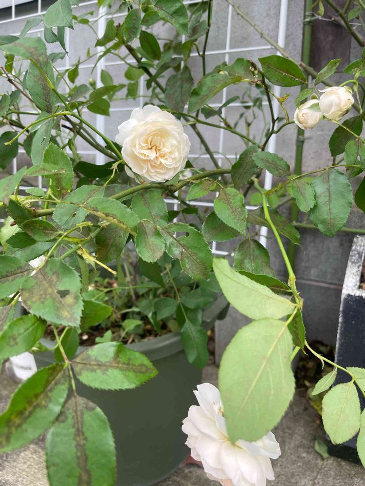 鉢植えのリッチフィールドエンジェル🤍葉っぱが黒点病などで元気が無かったけど、お花が咲き始めました🤍