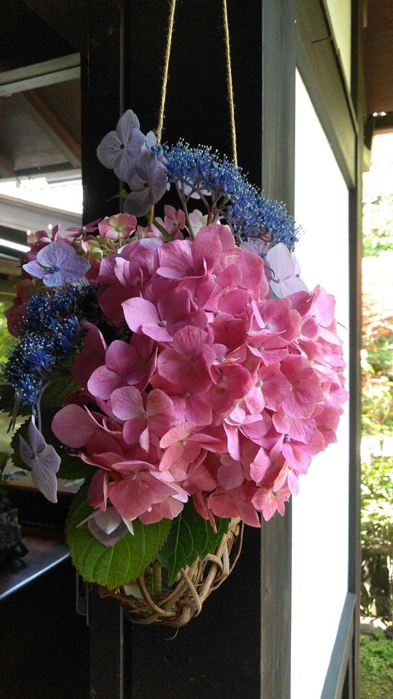 北鎌倉の古民家ミュージアムの入り口に紫陽花が吊るして活けてあります🌸🌿