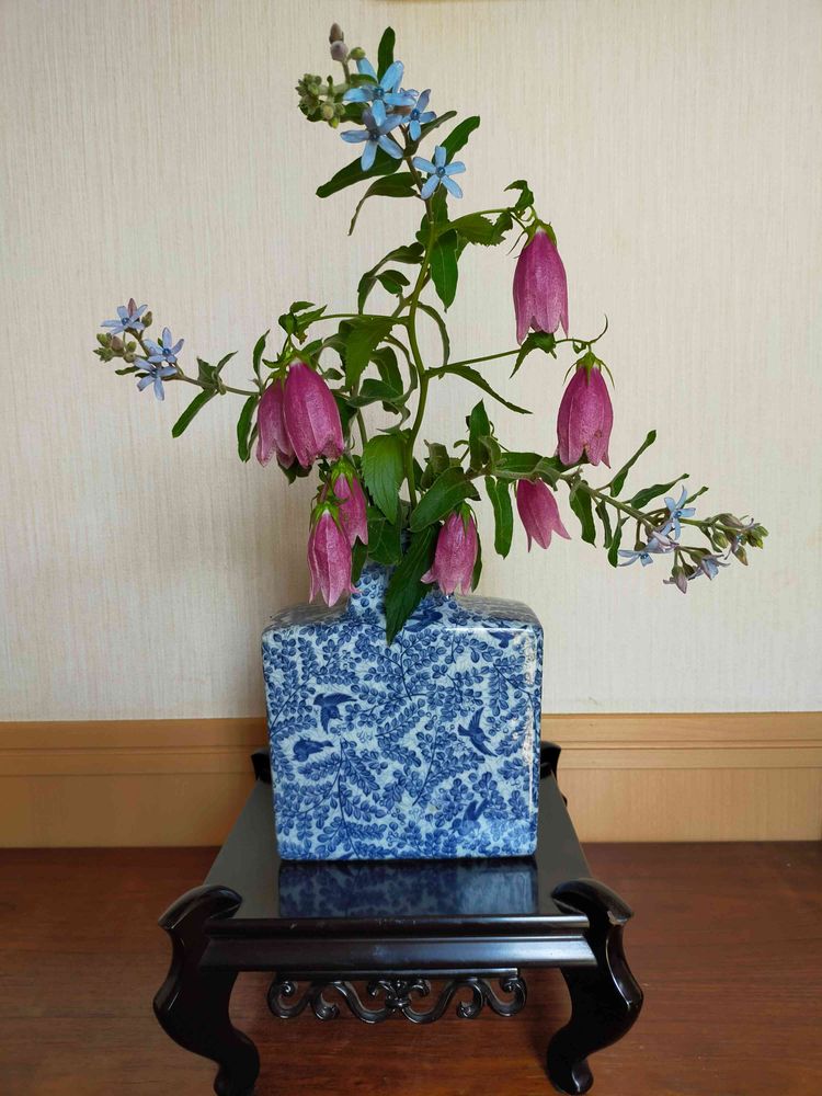 ブルースターが花瓶と一体になり、ホタルブクロがより印象的に見えます