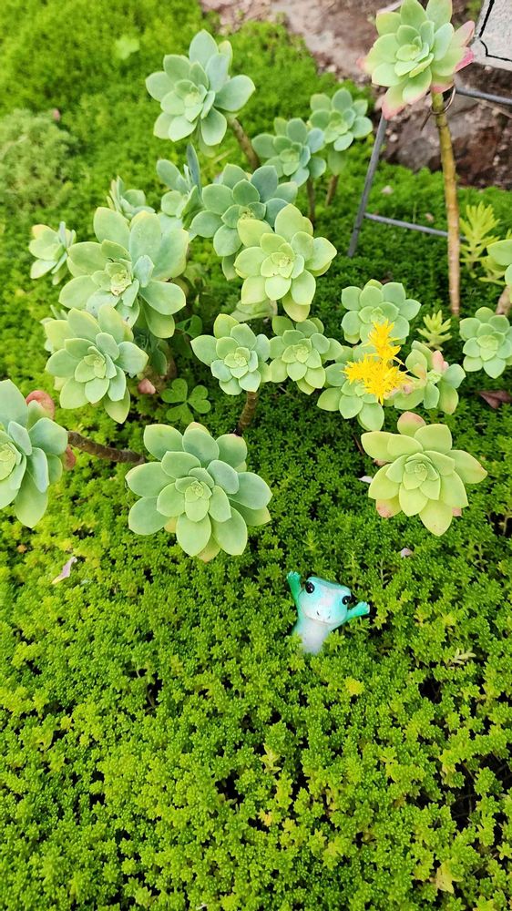 多肉ちゃんと同じ色のカエルくん🐸いつもセダムの中に埋もれていってしまいます💦