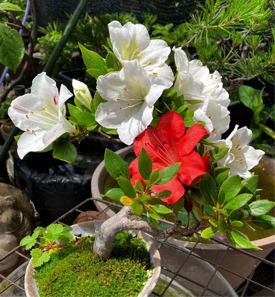 この皐月、18年前に東京の有名な盆栽園を年末に訪れたところ、あいにく仕事納めの大掃除中で観覧できず園主の有名な盆栽家の方がせっかくなので入園記念にと下さった苗木なんです。中々うまく育たなくて毎年グンバイ虫の餌食になりながら瀕死の状態で過ごしてきましたが、昨年から元気を取り戻し今年遂にこんなに綺麗な花を咲かせてくれました。過ぎていった歳月を思いつつ改めてよく頑張ったと感心と感謝、先生ありがとうございました。