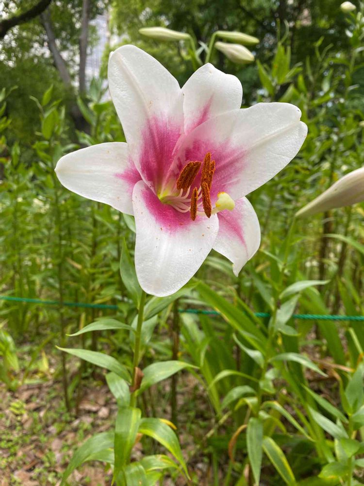 白地に中央部の濃紅色が印象的のテッポウユリです。