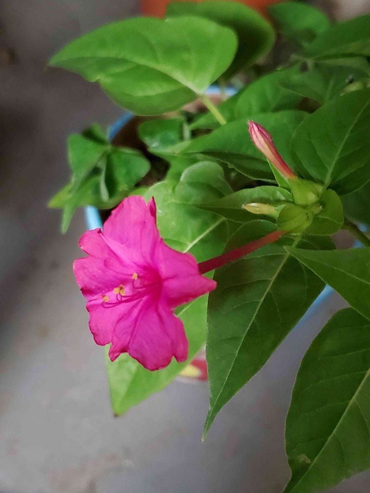 夜ベランダをのぞいたら、赤いオシロイバナが開いていました。こぼれ種から生えてきた。
