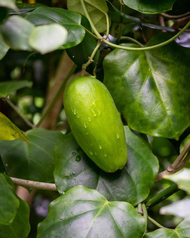 雨上がり、キジョランの実が重そうにぶら下がっていました。昨年秋のつけた実。今年の秋には熟すということでしょうか?2023.05.31.撮影