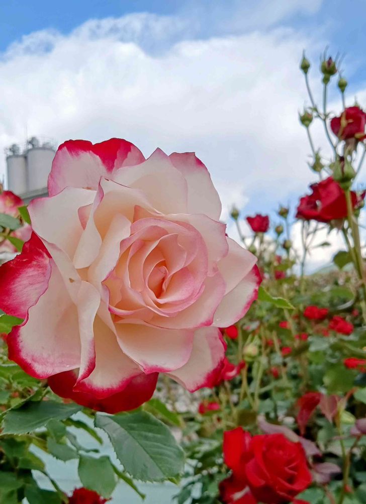 青空に映える可愛い薔薇🌹ですね!フリルが色変わりになって、珍しいですね!