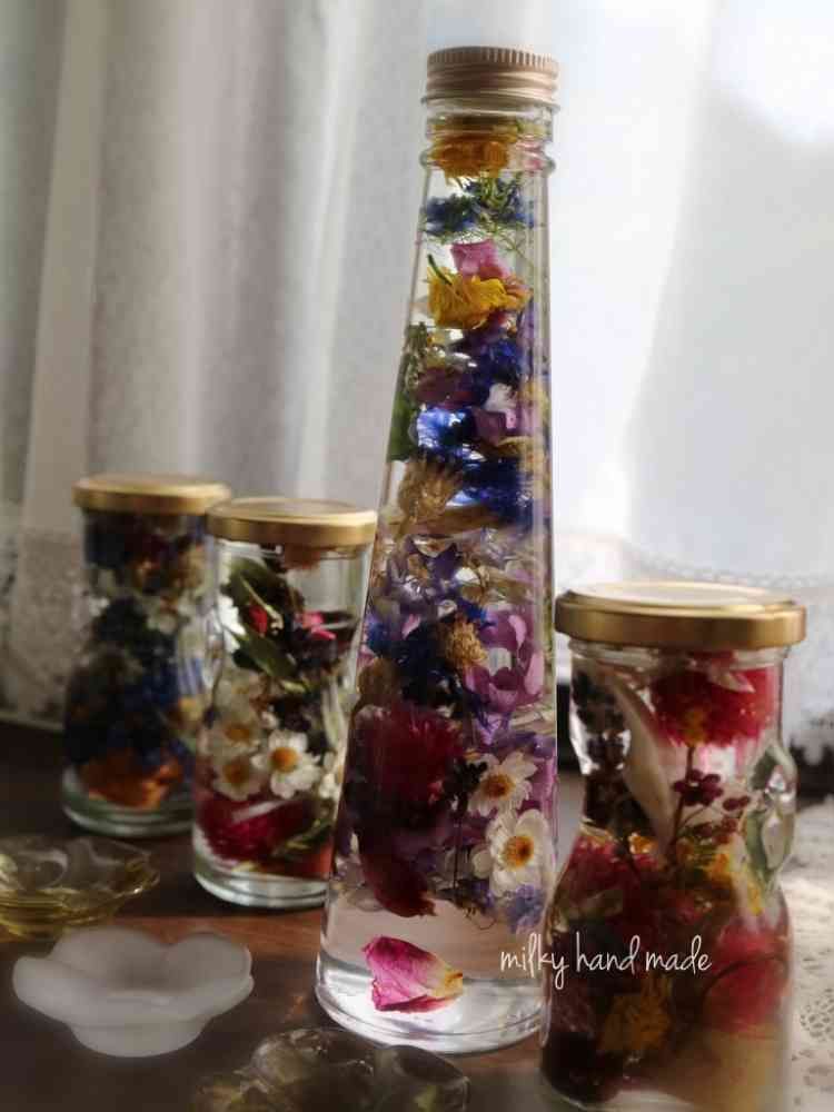娘がオイルと瓶を買ってきてくれたので、ハーバリウムに初挑戦🔰