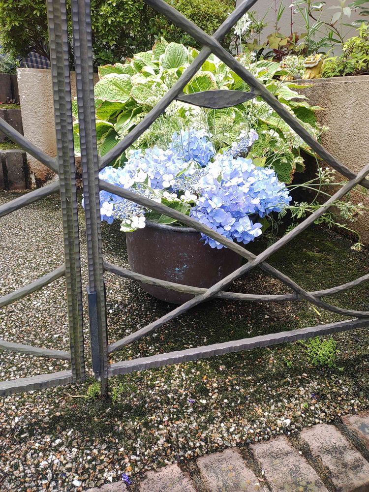 門扉の中に、庭で咲いているアジサイを切って花束みたいに飾ってみました。アジサイだけでは安定しないので、おわりかけのオルラヤをブスブス抜いて、一緒に水にドボン。💦