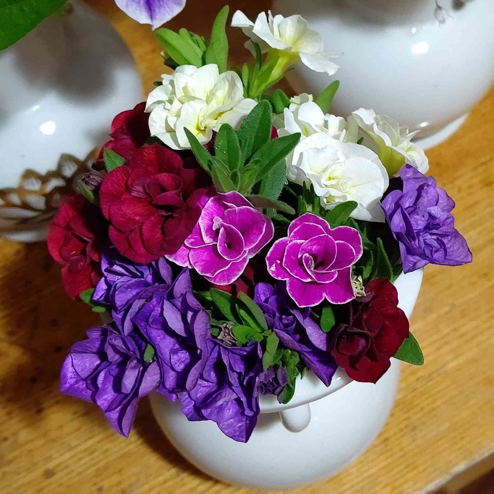 PWのスーパーベル4種類の切り戻し剪定した枝を花束状に飾りました。