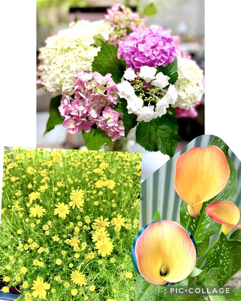 頂いた紫陽花と小さな黄色いデージーと鉢植えのカラー真っ黄色だった筈が少しオレンジ色も混ざっています💕