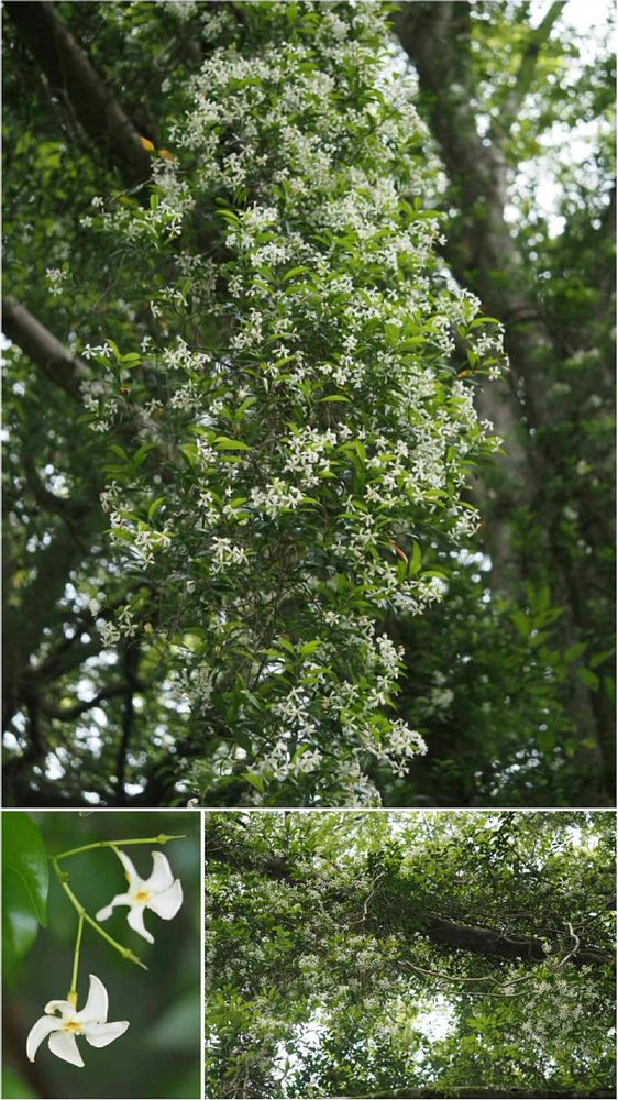 大きな樹に絡み付き溢れる様に枝から垂れ下がるテイカカズラの花。