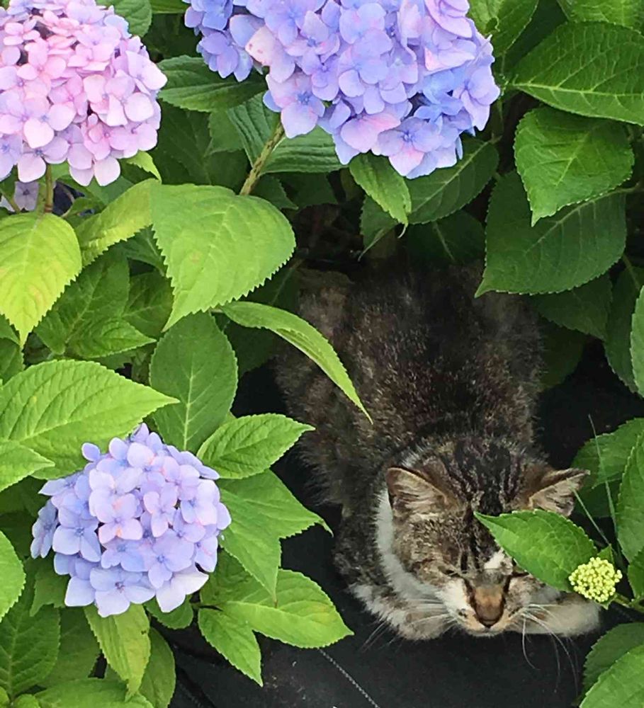 紫陽花のなかでお昼寝中の猫ちゃん🐈🐱
