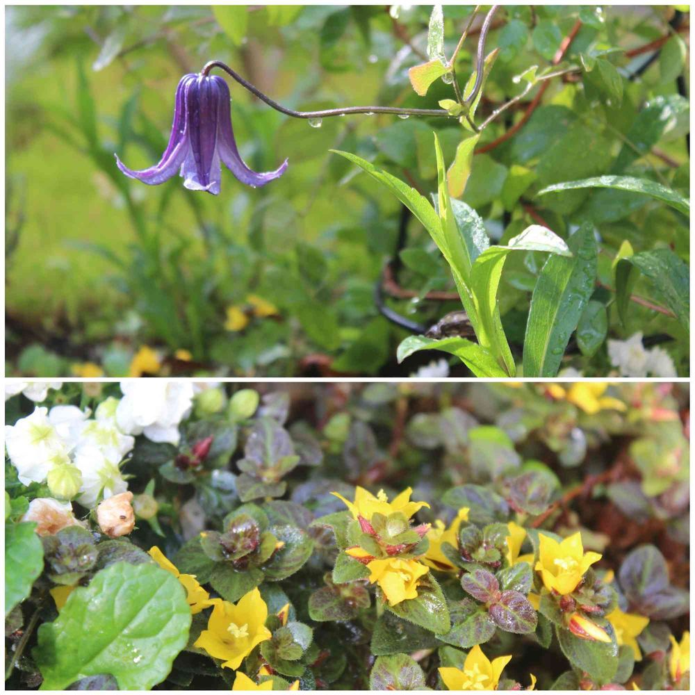 よく咲くベル型のクレマチスと、その下のリシマキアもカンパニュラも賑やかになってきました✨草🌱も😂