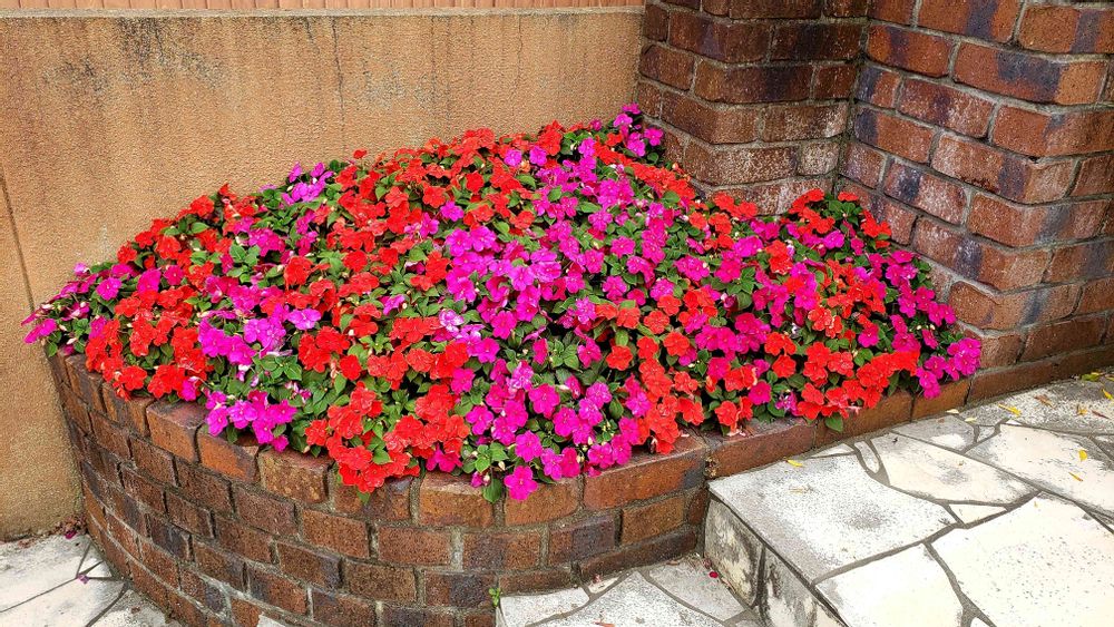 玄関アプローチの横の花壇でインパチェンスが満開になりました🙌🎶