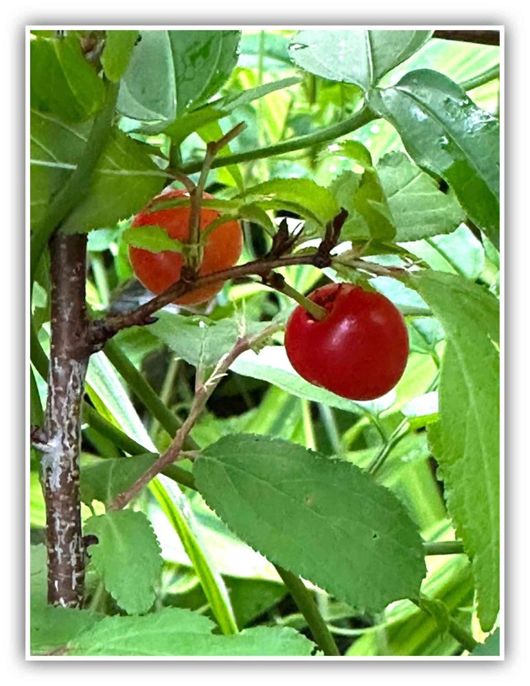 🌸花後は中庭の片隅に置いていただけで放置していましたら、このように🍒さくらんぼのような果実が5個成って、美味しそうに赤く熟れているのをパチリ撮ったものデスら😺