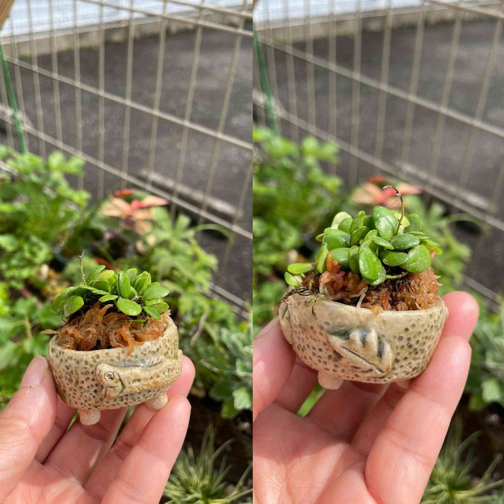 赤玉土が下に入っています、着生しやすいように水苔を上に乗せてあります😀