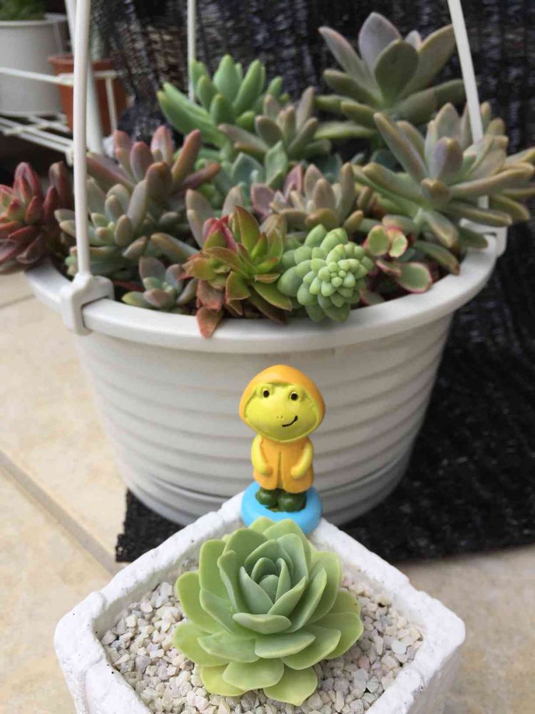 セリアで見つけたカエルちゃん(お顔が残念だったので手直し¨̮♡︎)、ハーブさんから頂いた寄せ植えと一緒にパチリ📸
