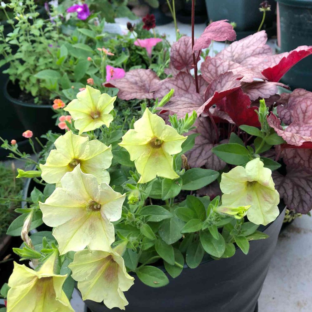 ヒューケラの葉色で一気に華やかな寄せ植えになるね(*^^*)