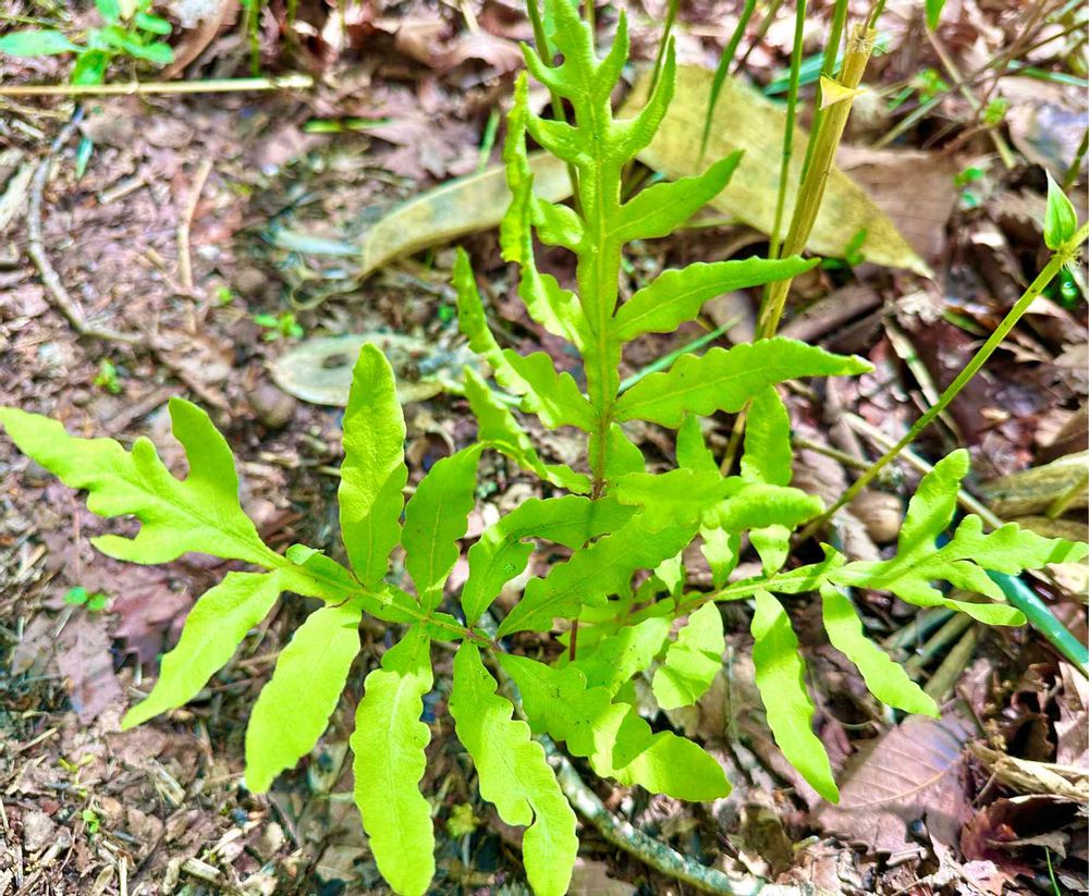 湿地に生えるシダの一種で「コウヤワラビ」羽片が幅広く柔らかでワカメのようなとも言われる。羽片はそのまま中軸の翼に流れる😊