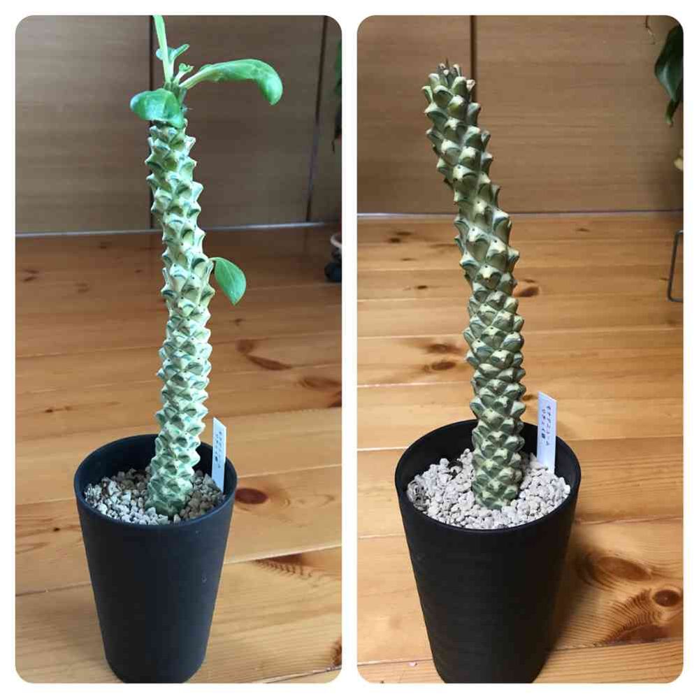 4月3日に投稿したモナデニウムリチェイ錦が、だいぶ伸びて葉っぱも出てきた!