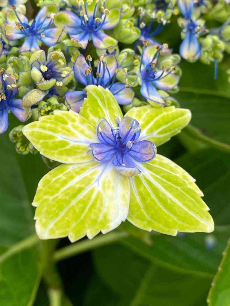 この装飾花(萼)の中心の青紫のお花(お花らしいです)の透明感に、目を奪われました😍🥰💕