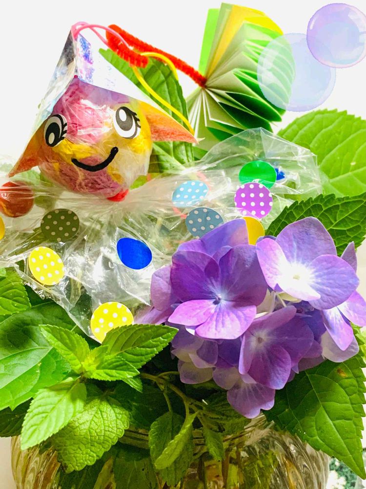 雨降りの日はてるてる坊主ちゃんもがんばりすぎないでおうちでゆっくりしてください💜昨年、挿し木した紫陽花さん、小さいですが咲きました💜おうちにご招待🌈