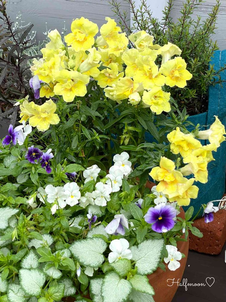 寄せ植えの金魚草がやっといっぱい咲いてきました💛