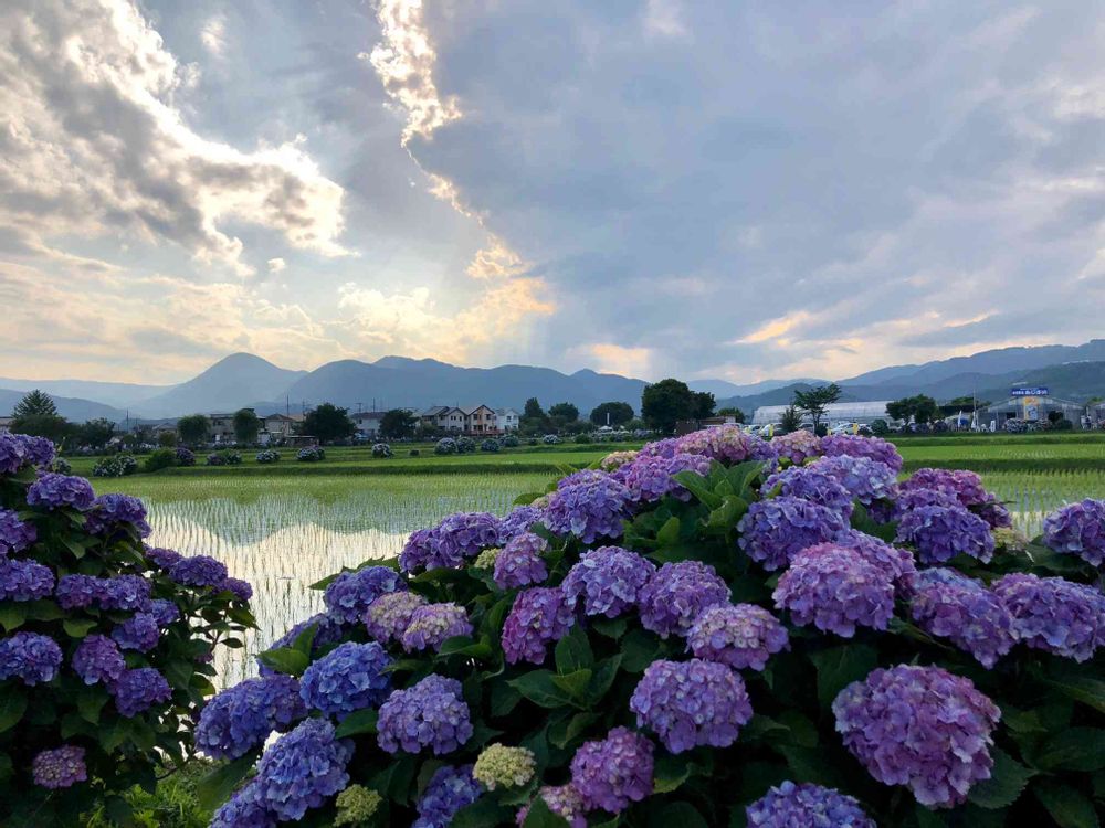 雲の色と田んぼに山の映り込みと紫陽花の色➰全部の色が良いですね~✨😍✨