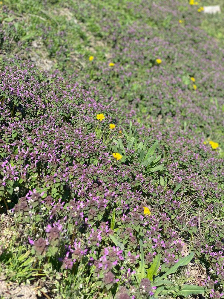 道路脇に ずっと続くタンポポ🌼とウツボグサ💜。。。と思って 投稿しましたが、ウツボグサではなく ヒメオドリコソウと 教えて頂きました😆
