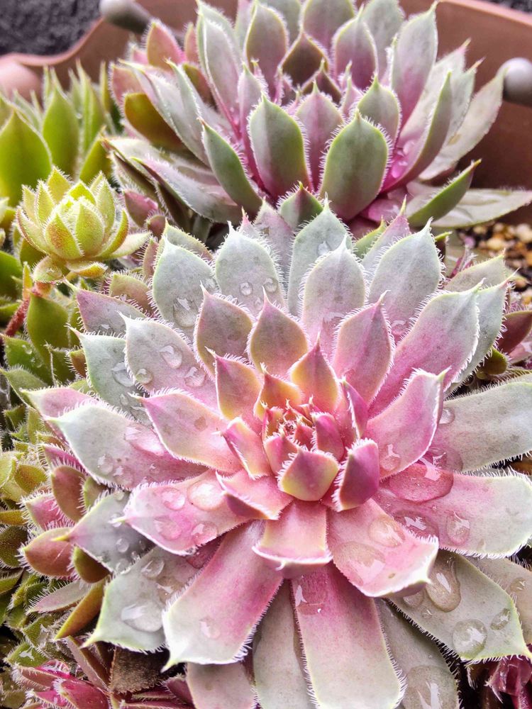 雨粒が残っている センペルビウム・ラベンダー&オールドレースさん😻🩷🤍💜