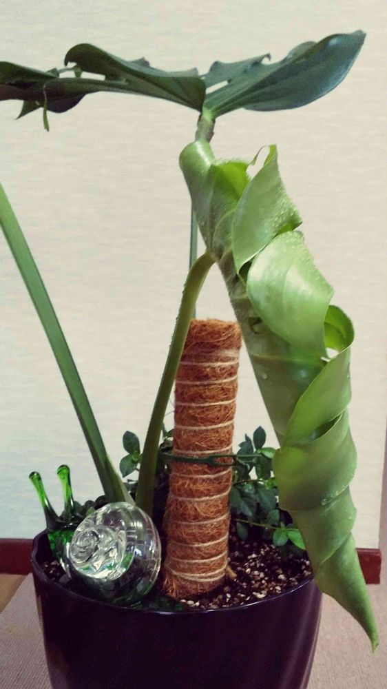 玄関のモンステラに新しい葉っぱが💚今にも開きそうですが、もう既に切れ込みデザインが入っててビックリ🎵