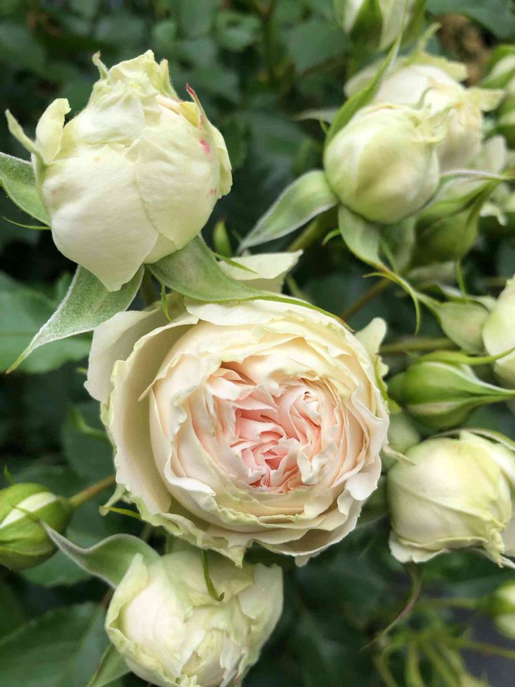 緑を帯びた白花の中央に薄い桃色の花びらがぎっしり詰まっている。コロコロとした花形がとても愛らしい。