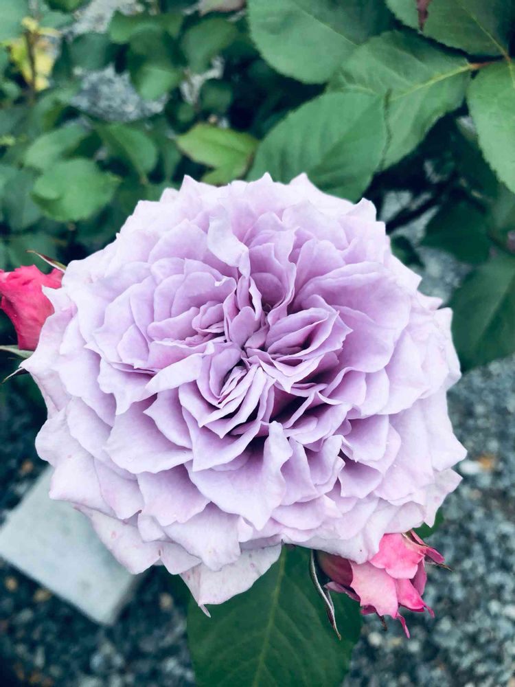 落ち着いた藤色、弁先がつんと尖る宝珠弁咲き~ロゼット咲き、中輪房咲きの花。