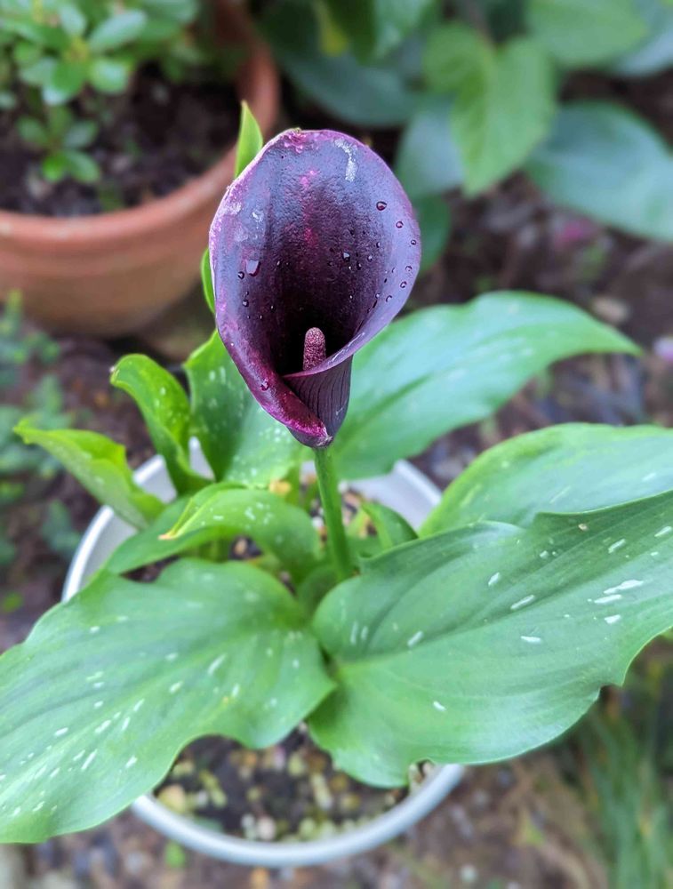 去年、溶け出してもう駄目だなと思った紫のカラー、日陰だったけ と取り敢えず植えておいたら、葉っぱが出てきたの