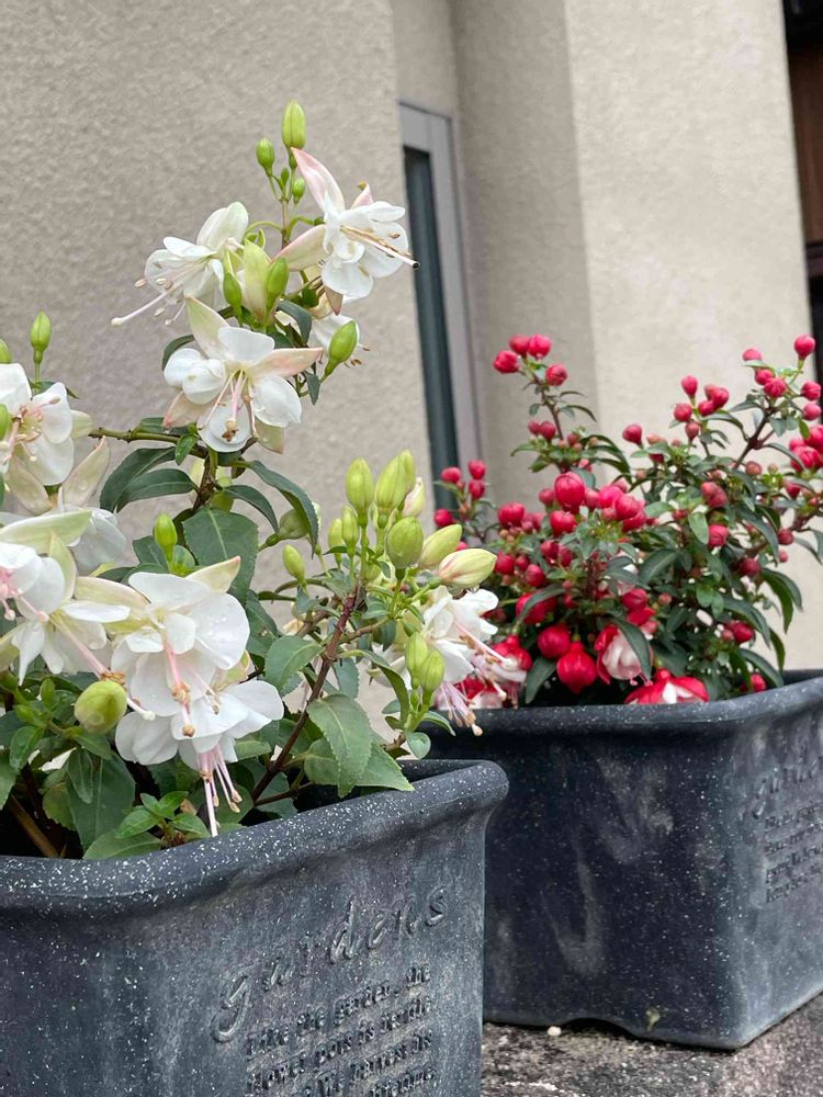 玄関の門塀に置いてあるフクシア