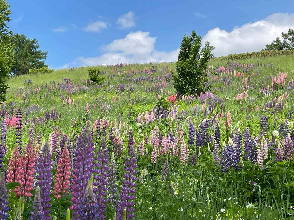 射的山への道に揺れるルピナスたち💜🩷🤍😍💖