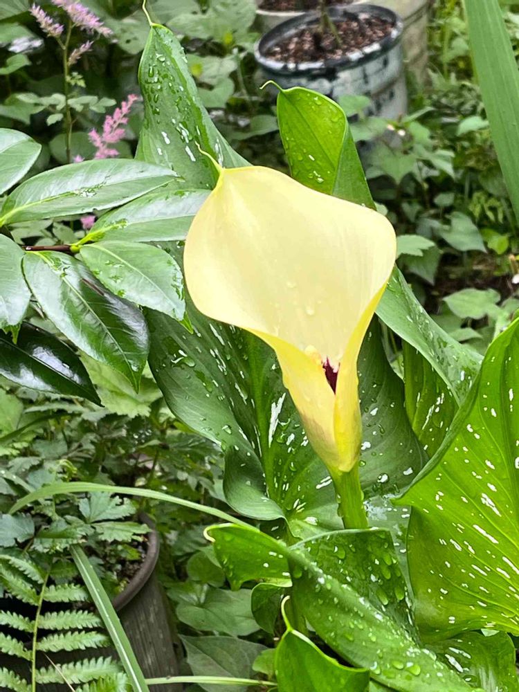 カラー カメオ✨⭐️雨の中☔️やっと咲きました…けど何か色が違う感じ🤨もっとアプリコットみたいなはず?🤔草丈は高めで70cmくらいあります❗️🙋🏻♀️