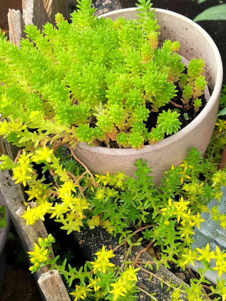 ウチの放ったらかし鉢のセダムがライムグリーン💚に光っています😊✨