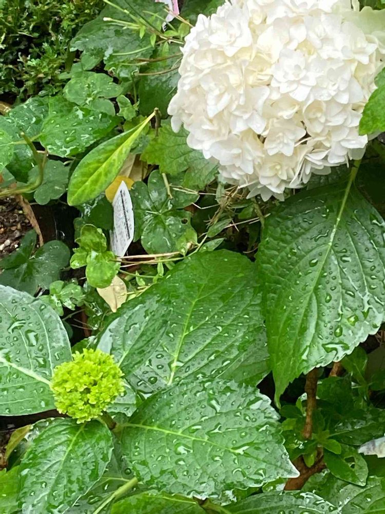 アジサイプリンセスアンの花と蕾です。純白の花がぎゅっと詰まったバラ咲きで、ボリューム満点です。