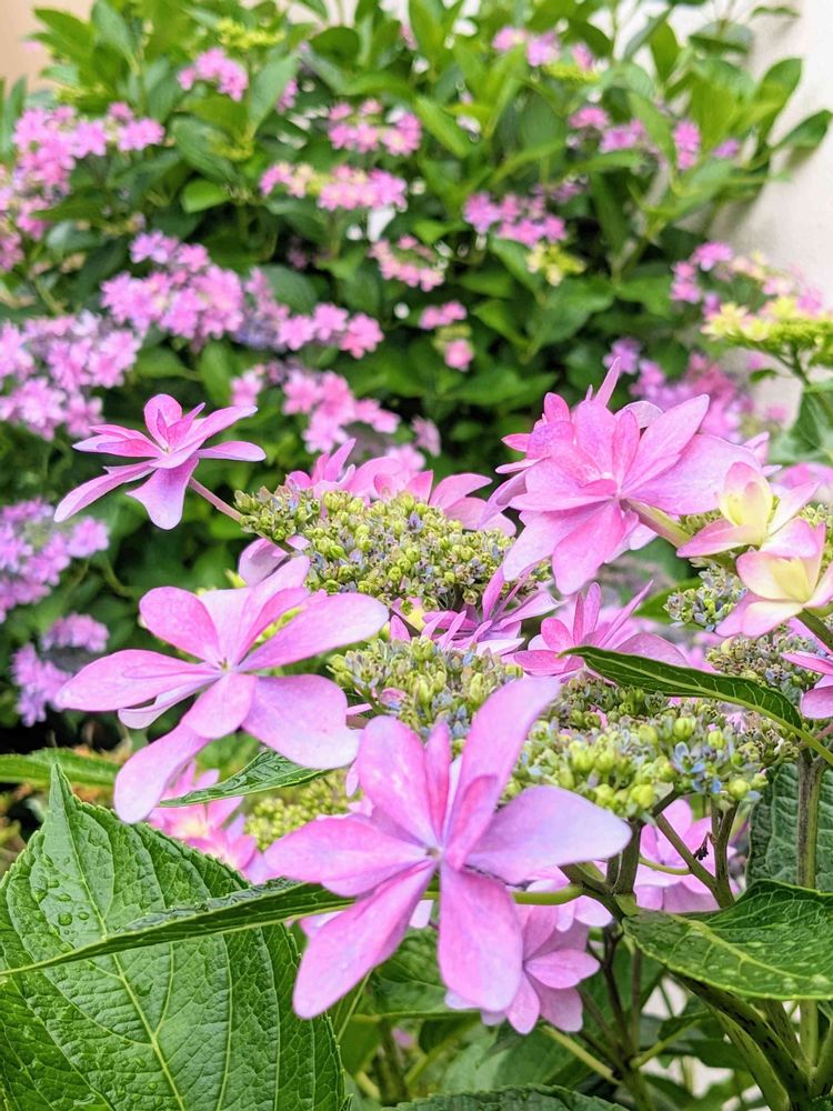 赤紫色⏩ピンク⏩薄ピンクへ変化しそうな額紫陽花…